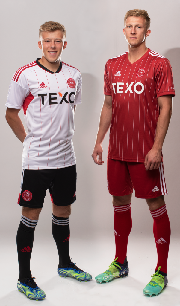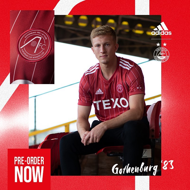 Les nouveaux maillots de football d'Aberdeen 2022-2023 sont un hommage aux maillots de football de la saison 1982-1983. Il y a quarante ans, Aberdeen a remporté la Coupe d'Europe II. En finale de la coupe des vainqueurs de coupe au Nya Ullevi de Göteborg, Aberdeen a battu le Real Madrid 2-1 grâce à des buts de Black et Hewitt. Le maillot domicile 2022-2023 de l'Aberdeen FC est entièrement rouge et se caractérise par de fines rayures blanches. Le maillot de football est également équipé d'un col en V. La poitrine droite contient le logo adidas en blanc et la poitrine gauche contient l'insigne du club. L'insigne contient une référence à la victoire de la Coupe d'Europe II il y a trente ans. Le sponsor principal TEXO décore le milieu du maillot. La manche gauche contient deux étoiles brodées, qui font référence à la victoire en Coupe d'Europe II et en Super Coupe d'Europe en 1983. Les bandes adidas sur les épaules sont blanches. Le dos du maillot est entièrement rouge. Le maillot domicile d'Aberdeen est complété par un short de football rouge avec des bandes blanches adidas sur les côtés. Les chaussettes sont également rouges avec des bandes blanches adidas sur le dessus.
