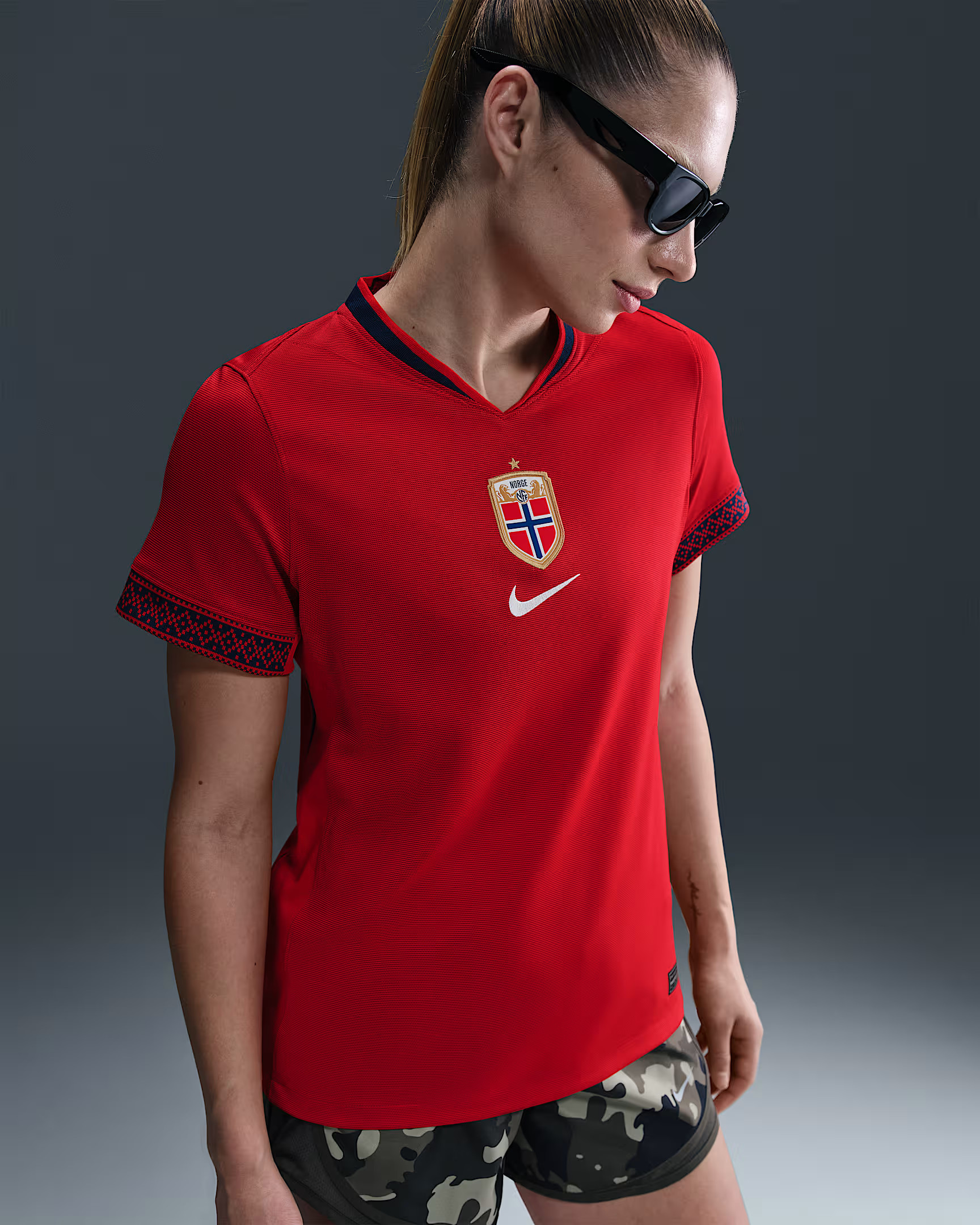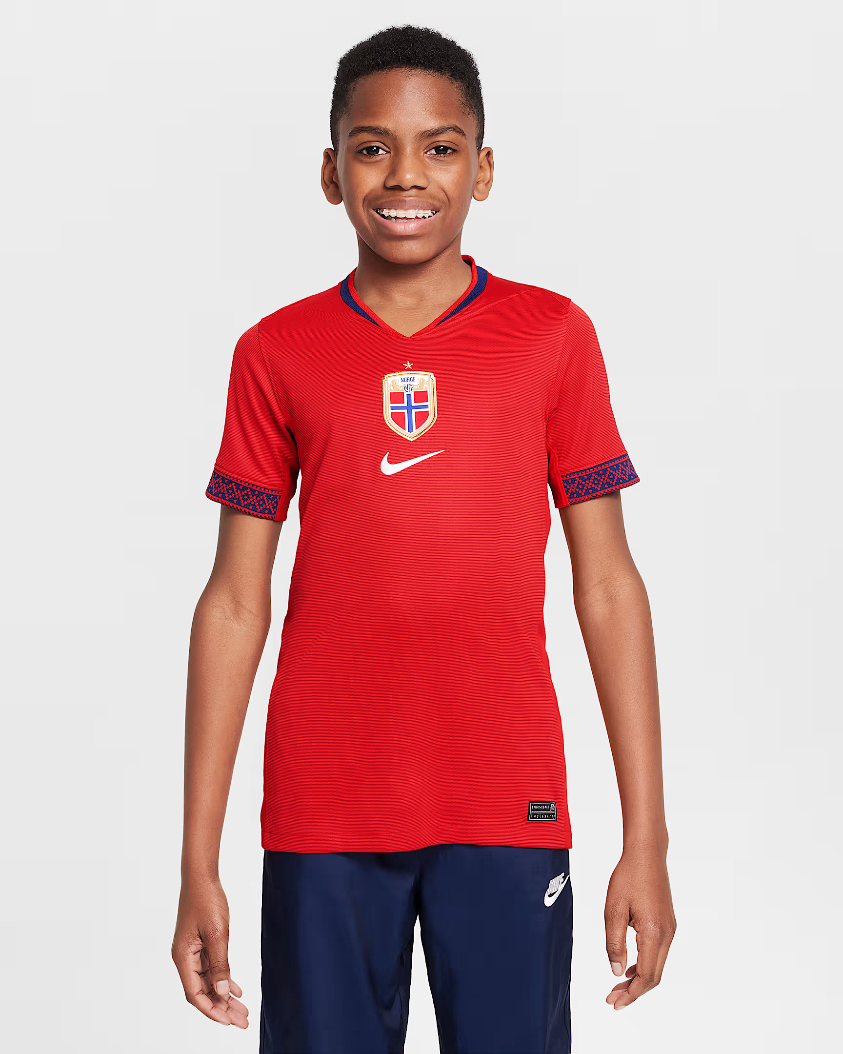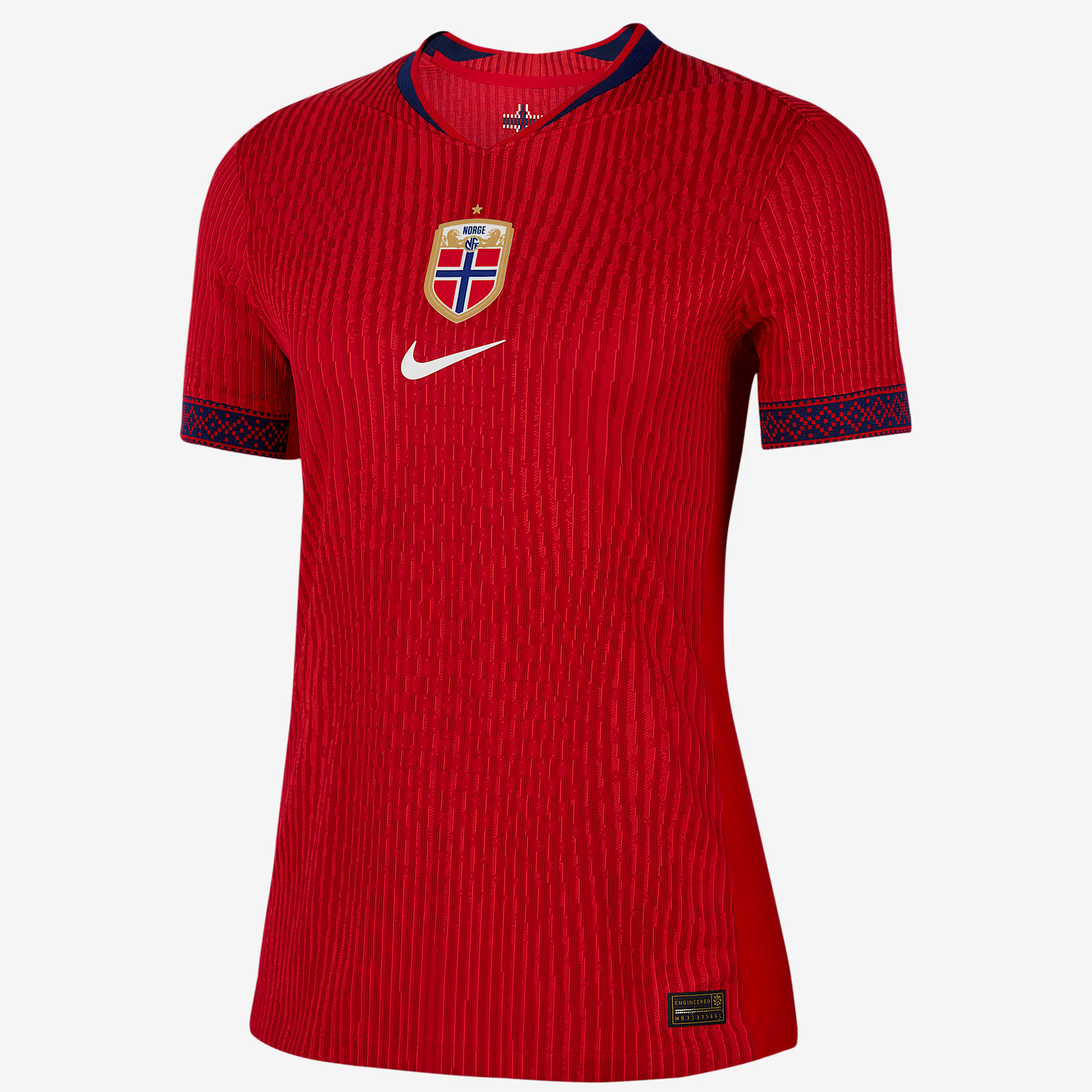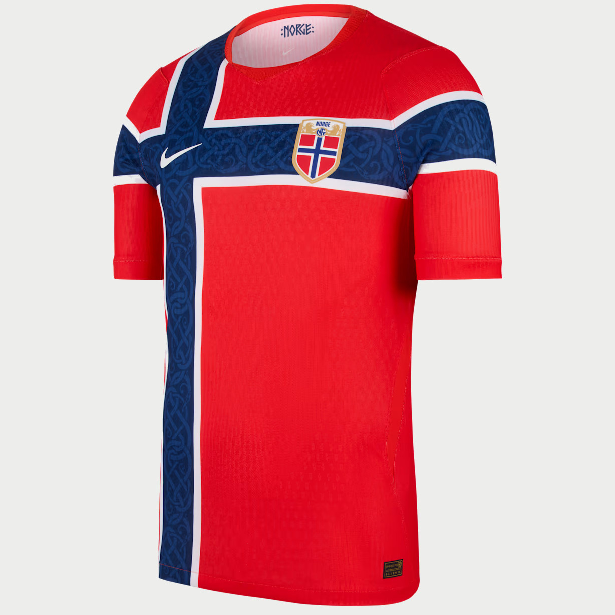 Le maillot domicile de la Norvège 2024-2025 s'inspire du drapeau norvégien ! Le maillot de football contient toutes les couleurs du drapeau. Les côtés du maillot de football sont équipés de rayures verticales dans différentes nuances de rouge. Les deux bandes du milieu sont bleues et les bandes à côté sont blanches. Un effet spécial a été incorporé dans les rayures bleues. Cet effet diamant fait référence aux épées des Vikings, inspirées du surnom de l'équipe nationale. Le col rond est bleu foncé et la bande en bas des manches est blanche avec un trait bleu. Les logos de la Fédération norvégienne de football (Norges Fotballforbund/NFF) et de Nike sont situés au centre de la poitrine. Le dos du maillot de football norvégien est rouge foncé. Ce maillot de football est composé à 100 % de polyester et est équipé de la technologie Nike Dri Fit, qui assure l'évacuation de l'humidité et la ventilation.