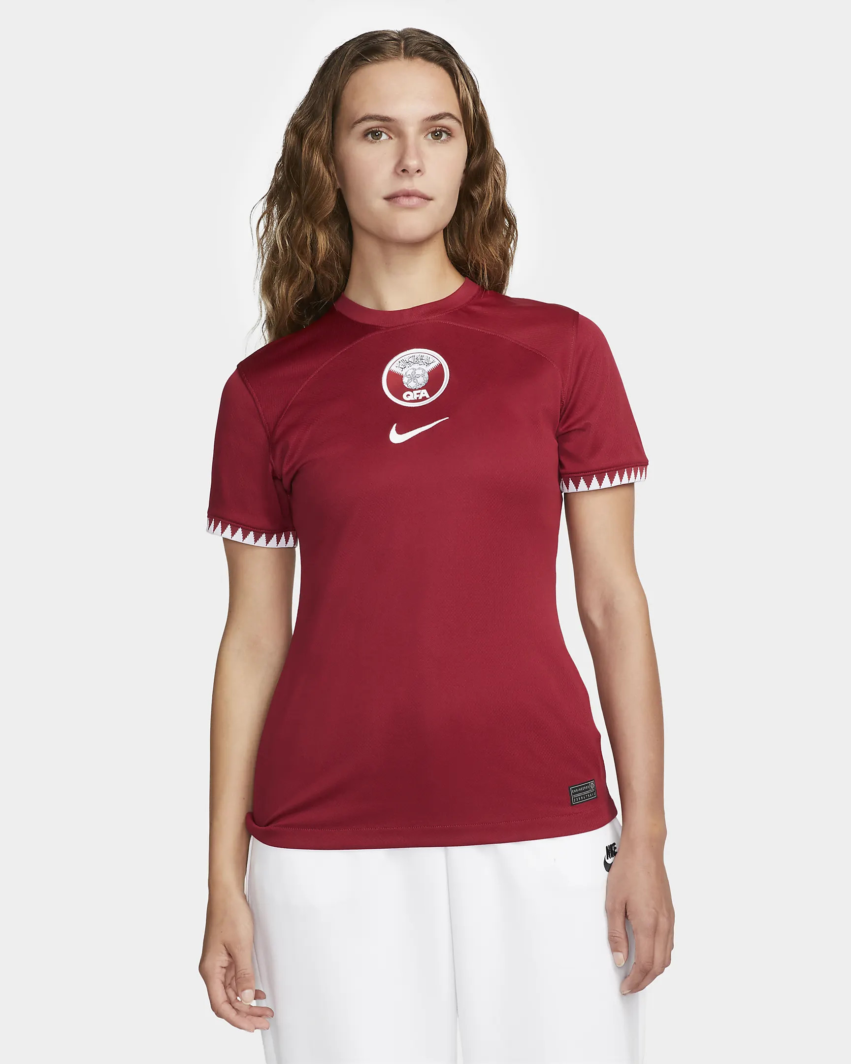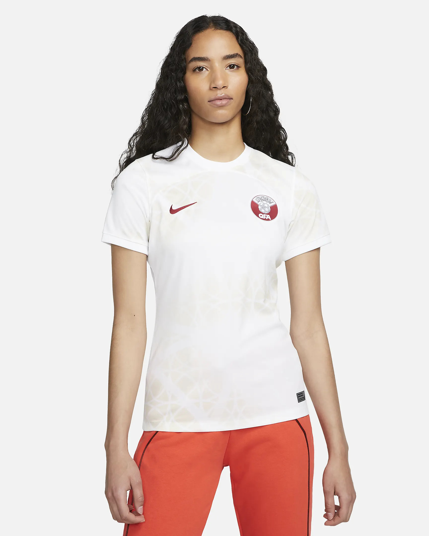 Le maillot Qatar 2022-2023 Away s'inspire du littoral du pays, tandis que le subtil imprimé graphique de perles fait référence à l'histoire de la pêche à la perle dans la région côtière. Lorsque les joueurs se déplacent dans ce maillot de football, l'imprimé ressemble à une tempête de sable tourbillonnant sous le soleil aride. Le maillot extérieur du Qatar est doré/beige et contient un imprimé intégral d'anneaux et de cercles qui se chevauchent. Le maillot extérieur du Qatar contient également un col rond avec une courbe en dessous. Le Nike Swoosh est en rouge bordeaux sur la poitrine droite et la poitrine gauche contient le logo de la Football Association. Le nom du pays en arabe orne également le col du maillot extérieur. Cet uniforme est composé à 100% de polyester et est équipé de la technologie Nike Dri-Fit, qui assure le refroidissement du corps, protège de la chaleur et assure une évacuation plus rapide de l'humidité.